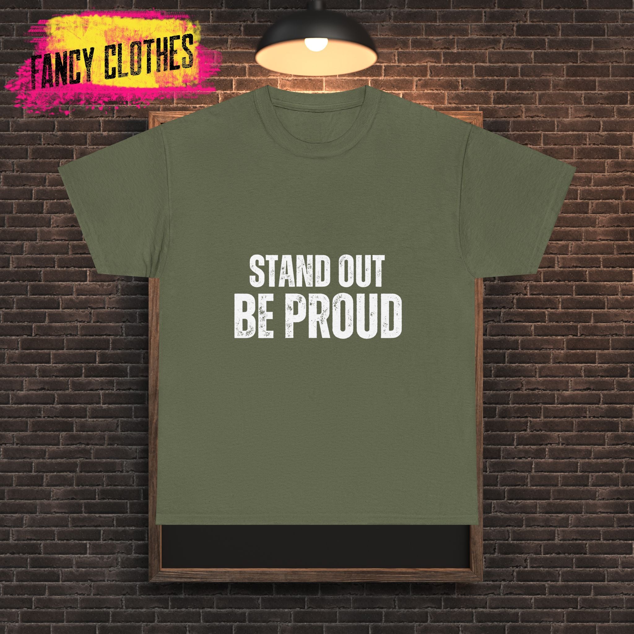 A classic unisex heavy cotton T-shirt featuring a funny quote 'stand out be proud' with bold lines. This T-shirt exudes a playful and confident vibe, perfect for those who want to make a statement. Ideal for casual wear, lounging, or as a conversation starter at social gatherings. Relevant for birthdays, casual Fridays, or everyday wear. Product features - Shoulder tape for added stability - No side seams for a cleaner look - Ribbed knit collar for elasticity and shape retention - Made from strong and smooth specially spun fibers - Classic fit and tear-away label for comfort Care instructions - Machine wash: warm (max 40C or 105F) - Non-chlorine: bleach as needed - Tumble dry: medium - Do not iron - Do not dryclean