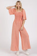 A mineral wash gauze ruched wide leg jumpsuit typically features a relaxed fit, wide legs, and ruched details that add a touch of texture and visual interest. The mineral wash adds a vintage, worn-in look to the fabric. This type of jumpsuit is perfect for a casual yet stylish outfit, and can be dressed up or down depending on the occasion.
