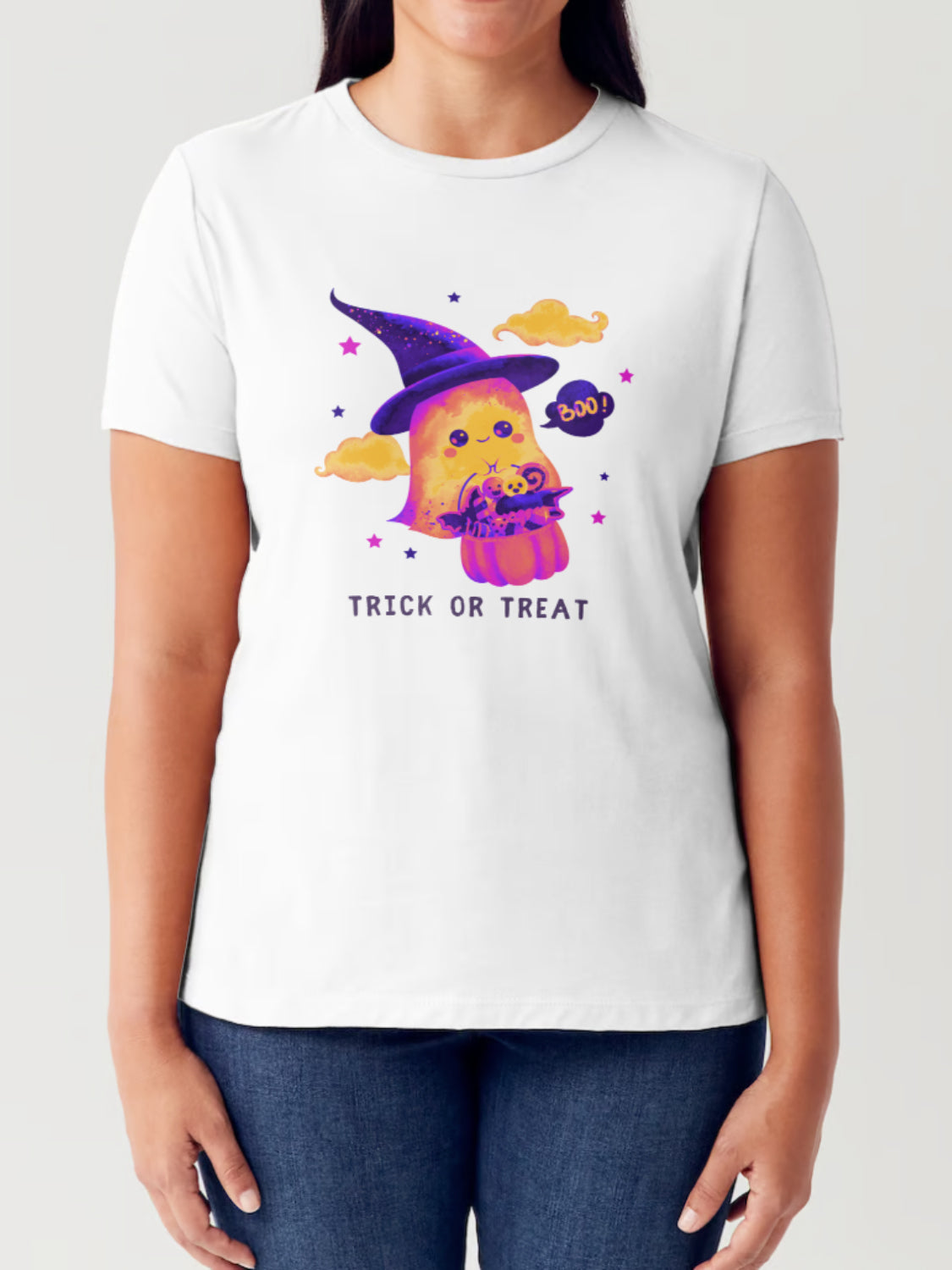 The TRICK OR TREAT Ghost Graphic Short Sleeve Tubular T-Shirt is a festive and playful option for the spooky season. Featuring a fun ghost graphic with a catchy phrase, this comfy tee is perfect for Halloween celebrations or casual outings. Its relaxed fit makes it a great choice for layering or wearing on its own!